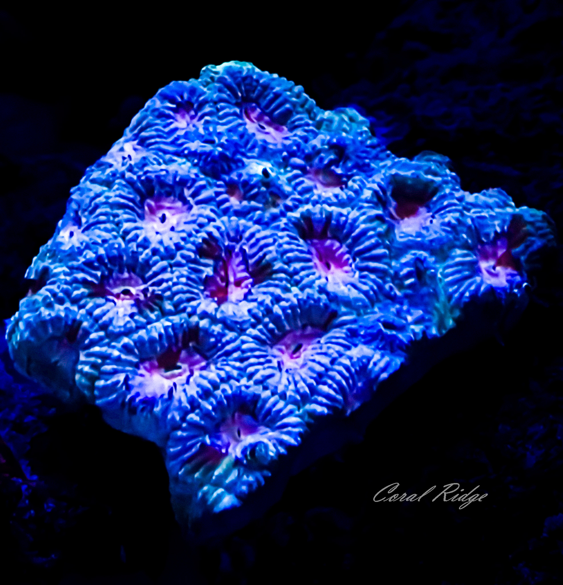 This stunning Favia showcases icy blue-gray ridges with vibrant pink mouths that glow under actinic lighting. Its intricate skeletal structure and bold contrast make it a standout piece in any LPS collection.