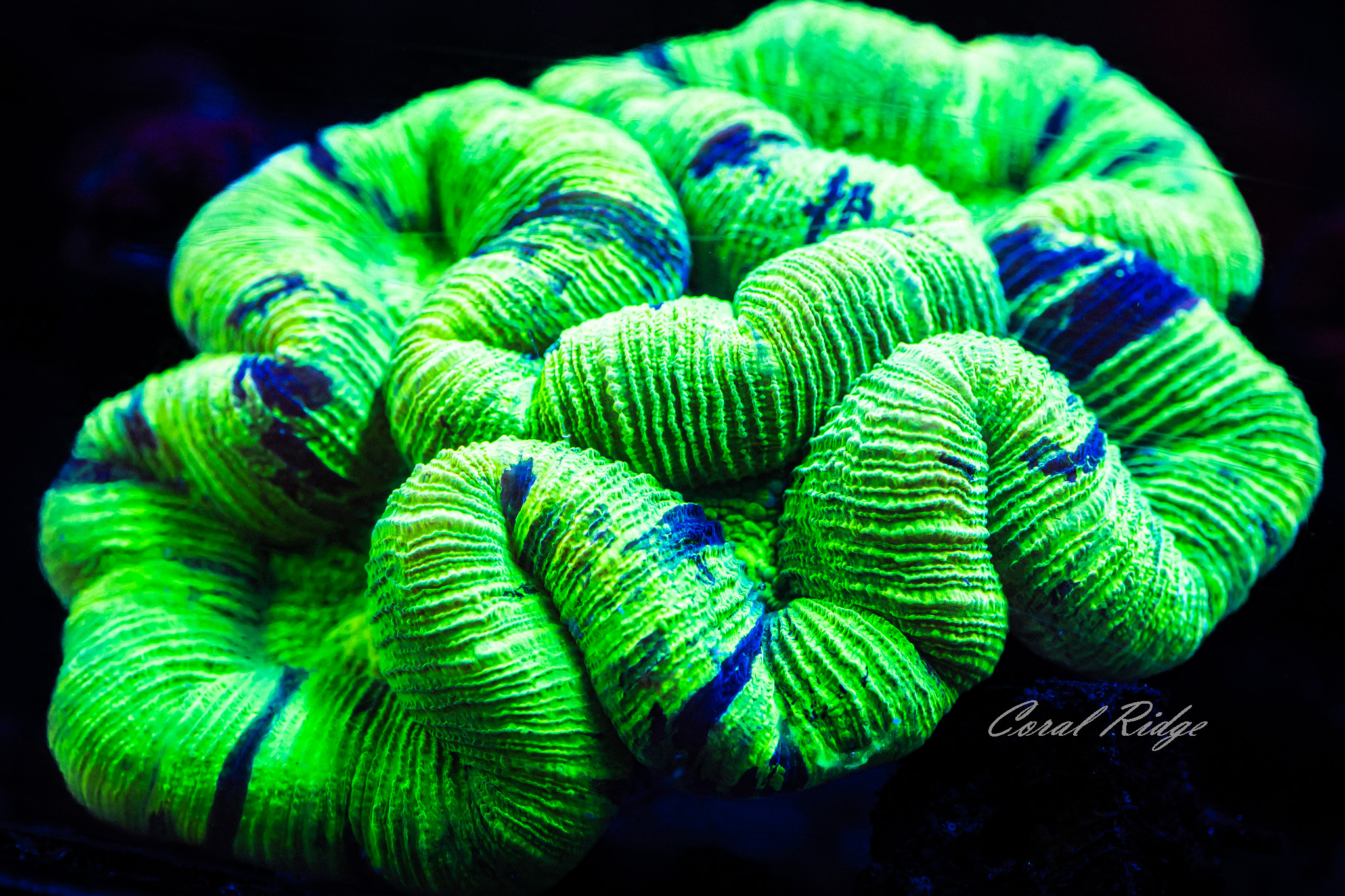 This ultra-bright Trachyphyllia features electric green ridges streaked with deep blue highlights, creating a hypnotic swirl of color and texture. Known for its fleshy folds and striking fluorescence under actinic lighting, this showpiece coral adds movement and drama to any reef.